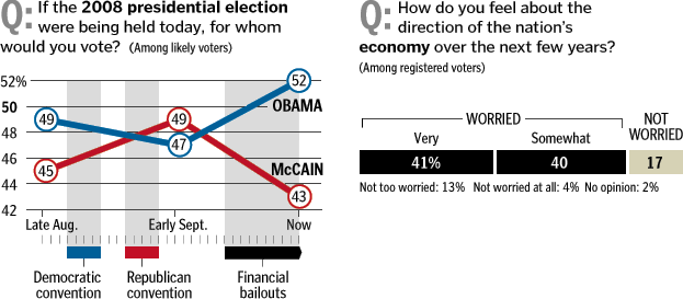 With this poll, OBAMA SURPASSED AL GORE IN 2000 AND JOHN KERRY IN 2004 IN LIKELY VOTERS. McCain knows this and it would have been almost certainly fatal for this to be the top headline hours before the first debate. So, no debate, change the subject, terrorize world markets with temperamental threats. McCain would rather lose our entire economy than lose the election.