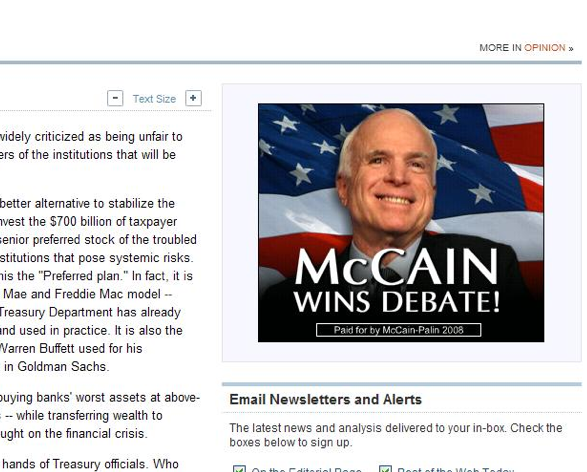 THIS JUST IN THE VERY IMPORTANT SERIOUS SENATOR JOHN MCCAIN, AFTER SOLVING THE FINANCIAL CRISIS AT HIS WHITE HOUSE MEETING YESTERDAY, HAS WON THE FIRST DEBATE SOME 7 HOURS BEFORE IT STARTED. MCCAIN’S STUNNING VICTORY, ANNOUNCED IN WEBSITE ADS, OCCURS LESS THAN AN HOUR AFTER HE SUDDENLY RENEGED ON A PROMISE TO STAY IN WASHINGTON, REFUSING TO DEBATE, UNTIL THE BAILOUT DEAL HE DELAYED YESTERDAY WAS REACHED. THIS TRIUMPHANT SCREENSHOT FROM TODAY’S WALL STREET JOURNAL BROKE THE NEWS.