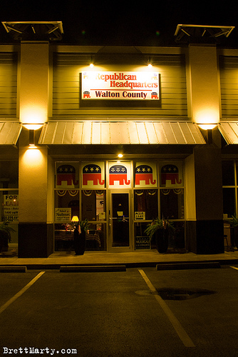 72 Hours To GoThis photo was taken by Brett Marty exactly 72 hours before the polls close in Florida. This is a photo of the McCain-Palin Victory Headquarters in the Florida panhandle. At the Obama equivalent, the lights were on and people were working. |