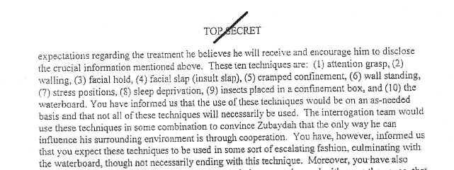 The first memo authorizes 11 days of sleep deprivation, saying it will do no harm. It is well known that Zubaydah gave no useful information as a result of these illegal tortures, which drove him permanently insane according to his Pentagon captors.
