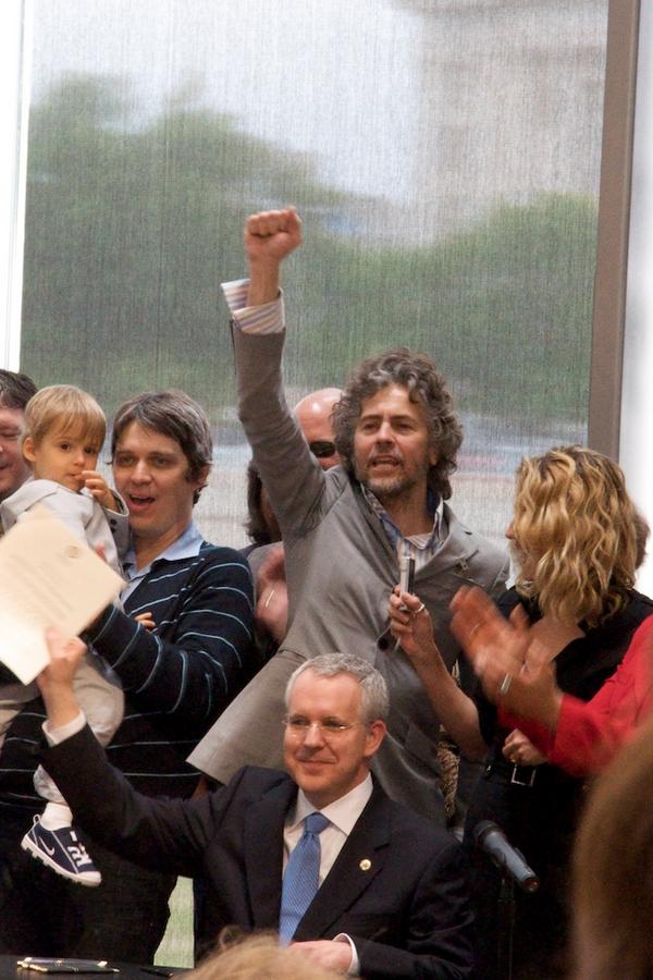 In a small ceremony a few minutes ago attended by some 400 people, Governor Brad Henry of Oklahoma signed an executive order proclaiming “Do You Realize??” by the Flaming Lips as the “Official State Rock Song.” Bassist Mike Ivins wore a “Ghostbusters” T-shirt under his jacket, whose circle-with-a-slash symbol looked vaguely like a hammer and sickle design. Speaking for the group (as he always does), Wayne Coyne said that he hoped the declaration of “State Rock Song” would help Oklahoma to be known for “more than just the Sooners and Toby Keith,” but also for its less-than-conventional musical scene. To add to the atmosphere, the Governor also declared April 28, 2009 as “Flaming Lips Day” in the State of Oklahoma. Score one for the good guys in Oklahoma.
